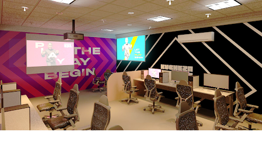 The identity extends into physical gaming labs, applying the same grid logic and visual language to immersive learning spaces.